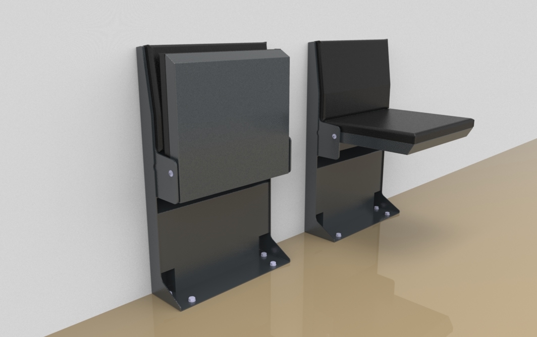 This fold down seat only needs to be fixed on the ground, helping to support a fold down seat that is mounted to a wall that could not support the seat construction or the extraction forces otherwise.