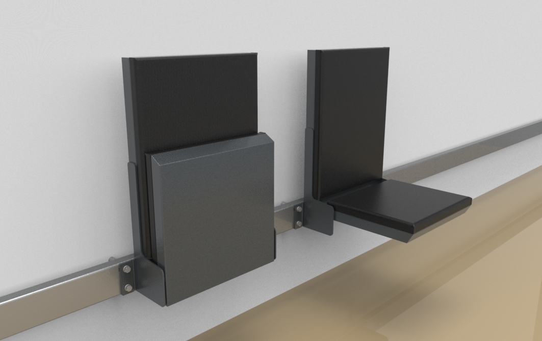 The seat is brought into a resting position by the means of springs that will automatically bring the seat back into resting position against the wall when not in use.